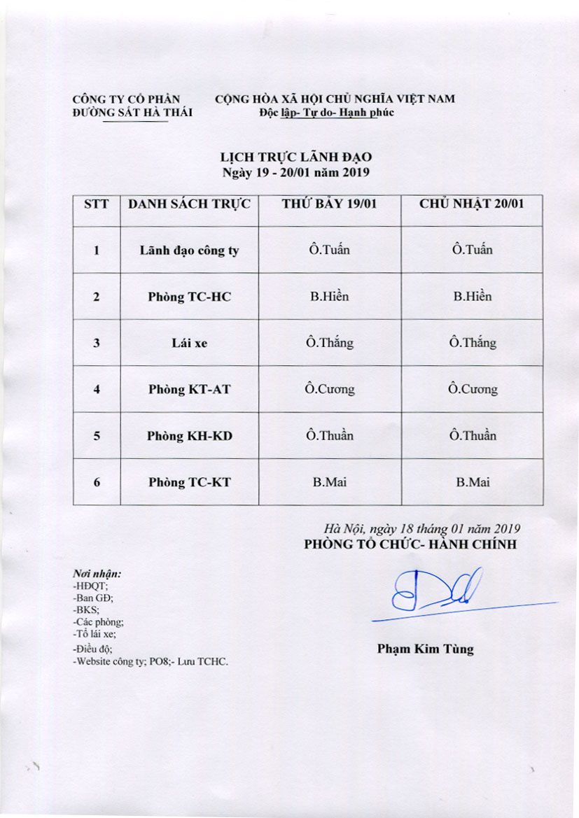 Lịch trực lãnh đạo Công ty ngày 19 và 20 tháng 01 năm 2019 Ngày đăng: 18/01/2019 - 09:10 Chia sẻ: | In bài viết