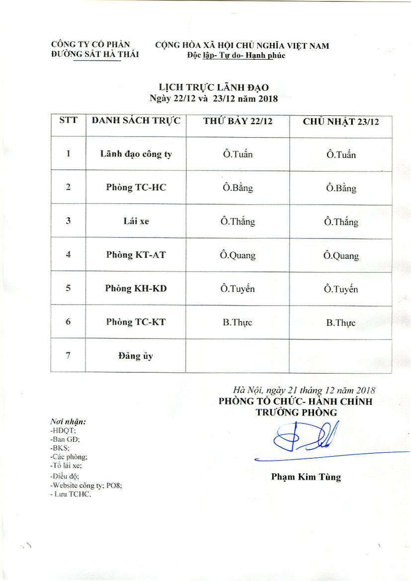 Lịch trực lãnh đạo Công ty ngày 22 và 23 tháng 12 năm 2018 Ngày đăng: 21/12/2018 - 10:29 Chia sẻ: | In bài viết