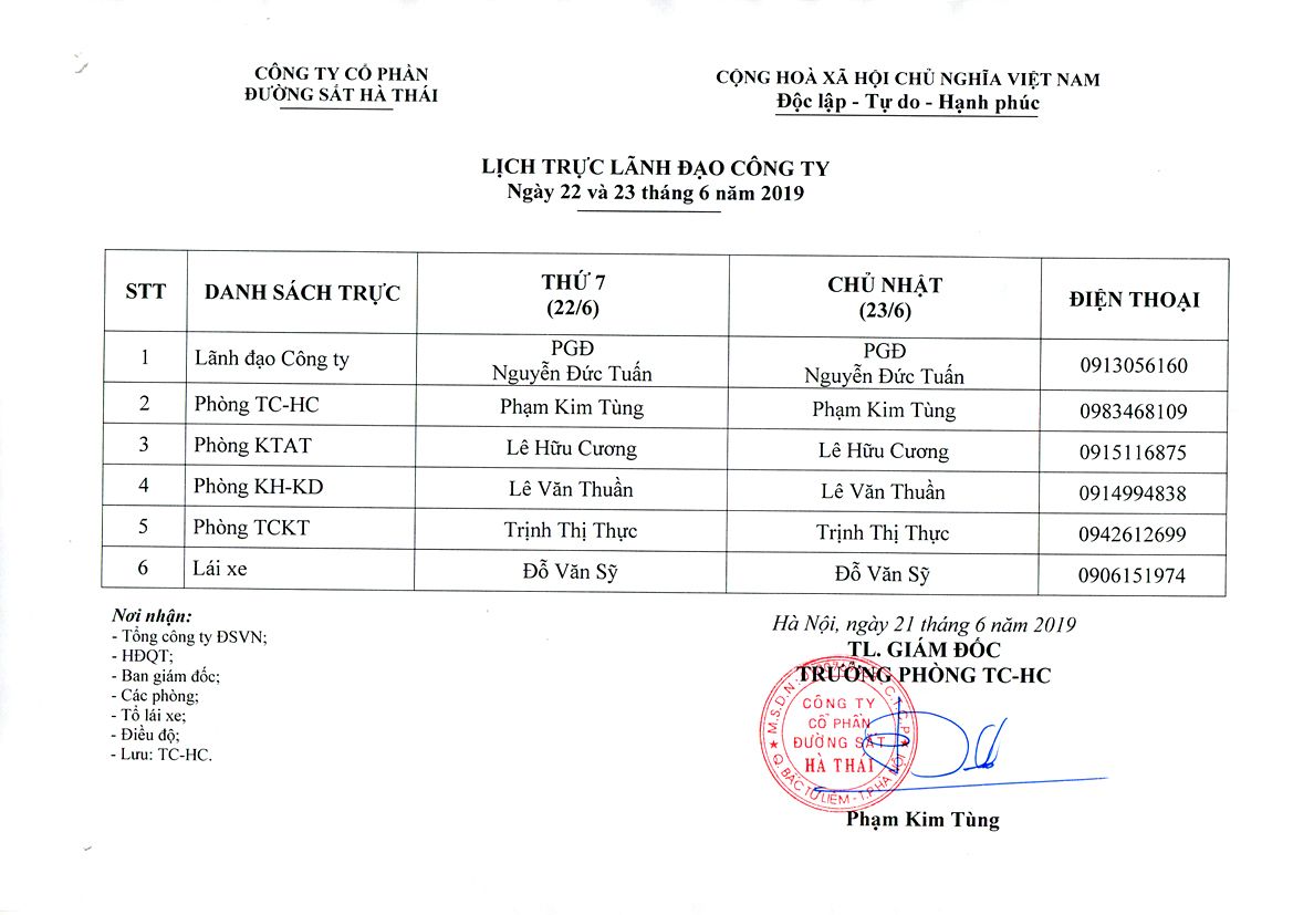 Lịch trực lãnh đạo Công ty ngày 22 và 23 tháng 6 năm 2019 Ngày đăng: 21/06/2019 - 09:29 Chia sẻ: | In bài viết