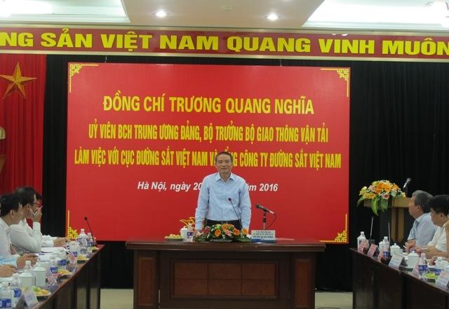 Chỉ đạo tại buổi làm việc, Bộ trưởng Trương Quang Nghĩa nhấn mạnh, Cục Đường sắt VN đang phải thực hiện hai nhiệm vụ lớn là chủ trì xây dựng Dự thảo Luật Đường sắt sửa đổi và thực hiện Chiến lược, quy hoạch tổng thể phát triển đường sắt VN, trong đó có đề án xây dựng đường sắt tốc độ cao Bắc – Nam. Đối với đề án đường sắt tốc độ cao Bắc – Nam chỉ nên chọn ưu tiên đầu tư xây dựng một đoạn tuyến ngắn trước để học tập, chuyển giao công nghệ cả về xây dựng, quản lý.