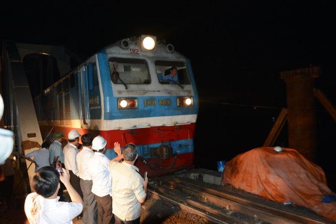 Lãnh đạo Tổng công ty ĐSVN chào đón đoàn tàu đầu tiên qua cầu