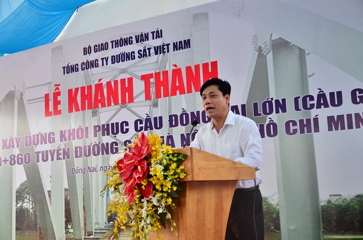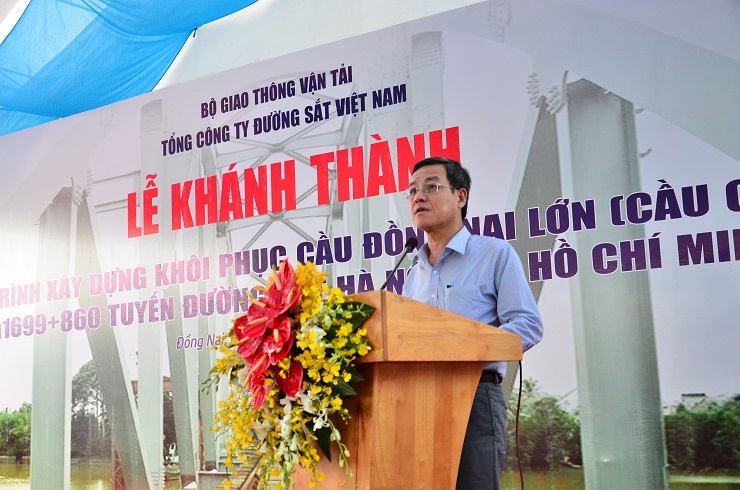 Thay mặt Bộ GTVT Thứ trưởng Nguyễn Ngọc Đông biểu dương chủ đầu tư và các đơn vị đã nỗ lực thi công cầu Ghềnh vượt tiến độ so với kế hoạch, nối lại tuyến đường sắt Bắc - Nam, phục vụ nhu cầu đi lại của người dân.