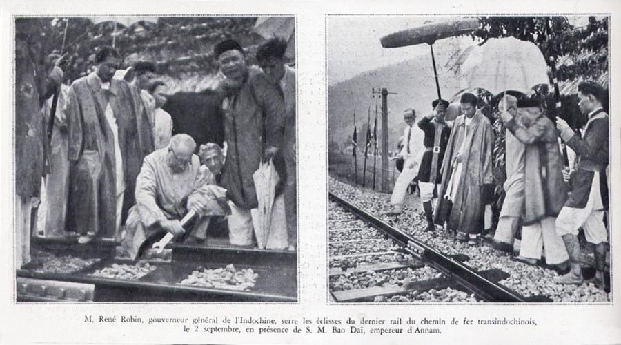 Toàn quyền Réne Robin và Hoàng đế Bảo Đại tự tay đặt những mảnh đường ray cuối cùng nối liền 2 đầu Bắc-Nam của tuyến đường sắt xuyên Đông Dương