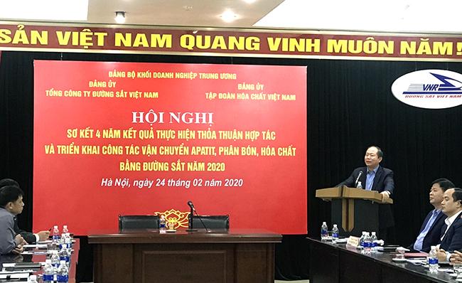 Tại hội nghị, Phó TGĐ Phan Quốc Anh đã đọc báo cáo tổng kết 4 năm kết quả thực hiện thỏa thuận hợp tác và triển khai công tác vận chuyển apatit, phân bón, hóa chất bằng đường sắt. Trong 4 năm (2016- 2019), tổng lượng vận chuyển apatit, phân bón hóa chất và các sản phẩm khác bằng đường sắt của các đơn vị thuộc VINACHEM đạt gần 6 triệu tấn, bình quân 1, 5 triệu tấn/năm, chiếm 27,09% tổng số hàng hóa của TCT Đường sắt Việt Nam.