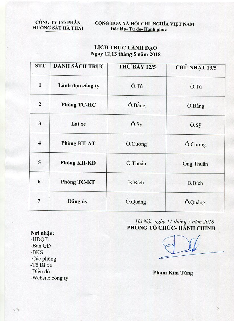 Số 209/TB-ĐSHT ngày 09 tháng 5 năm 2018 của Giám đốc Công ty cổ phần đường sắt Hà Thái về "Kết luận của Giám đốc Công ty tại cuộc họp Ban điều hành ngày 08/5/2018"