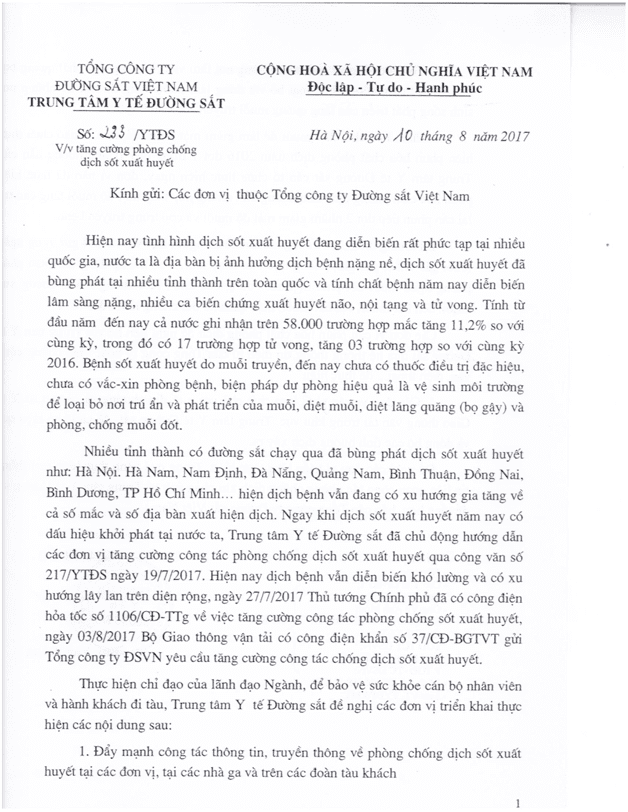 Số 233/YTĐS ngày 10/8/2017 của Trung tâm Y tế Đường sắt về việc tăng cường phòng chống dịch xuất huyết